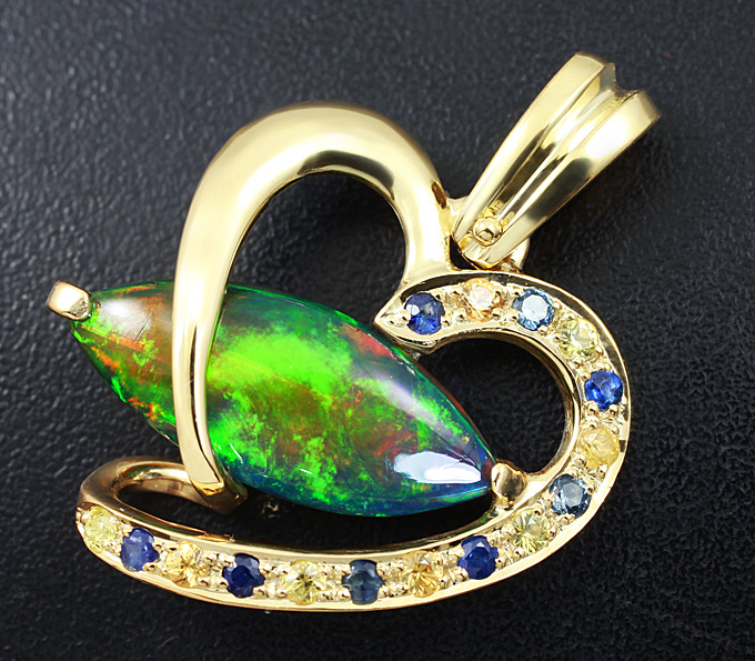 Вашему вниманию предлагается кулон из стерлингового серебра (925 проба) с кристаллическим черным опалом и разноцветными сапфирами! Изделие позолочено. Основные цвета опалесценции: красный, желтый, зеленый и синий. Размеры кулона с петлей 26 х 20 мм. Вес 2,4 г. Ниже приводятся ювелирные характеристики опала.