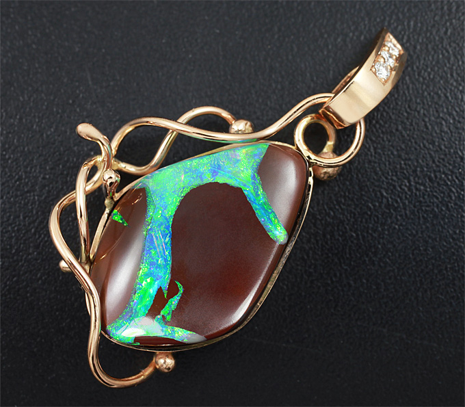 Вашему вниманию предлагается кулон из золота 585 пробы с австралийским болдер опалом и бриллиантами! Основные цвета опалесценции: зеленый/синий. Диаметр бриллиантов 3 мм. Размеры кулона с петлей 35 х 20 мм. Вес 5,6 г. Ниже приводятся ювелирные характеристики опала.