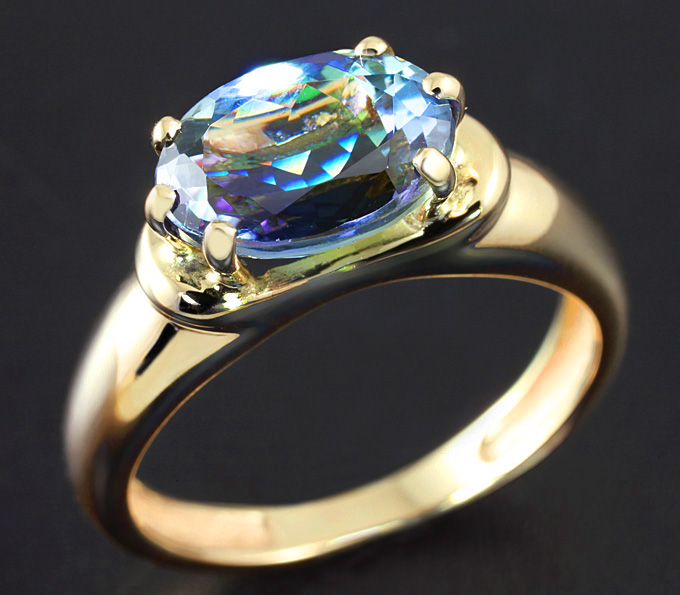 Вашему вниманию предлагается кольцо из золота 585 пробы с полихромным цоизитом! Камень сочетает фиолетовый и зеленый цвета. Площадка 11 х 7 мм, высота 7 мм. Вес изделия 4,3 г. Размер 17,5. Ниже приводятся ювелирные характеристики вставки.