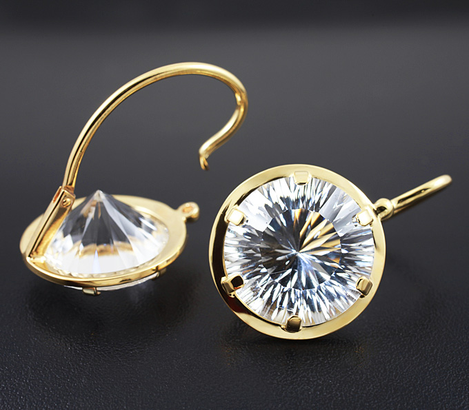 Вашему вниманию предлагаются серьги из золота 585 пробы с бесцветным кварцем! Размеры серег с петлей 27 х 18 мм. Вес пары 9 г. Ниже приводятся ювелирные характеристики вставок.