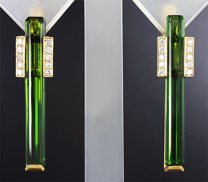 Вашему вниманию предлагаются серьги из золота 585 пробы с зелеными турмалинами и бриллиантами! Диаметр бриллиантов 1,25 мм. Площадка серег 30 х 7 мм. Вес пары 5,3 г. Ниже приводятся ювелирные характеристики турмалинов.