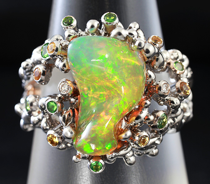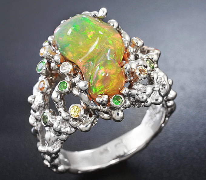 Кольцо c эфиопским опалом, желтыми сапфирами, цаворитами гранатами и бриллиантами