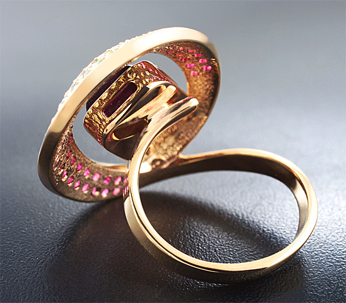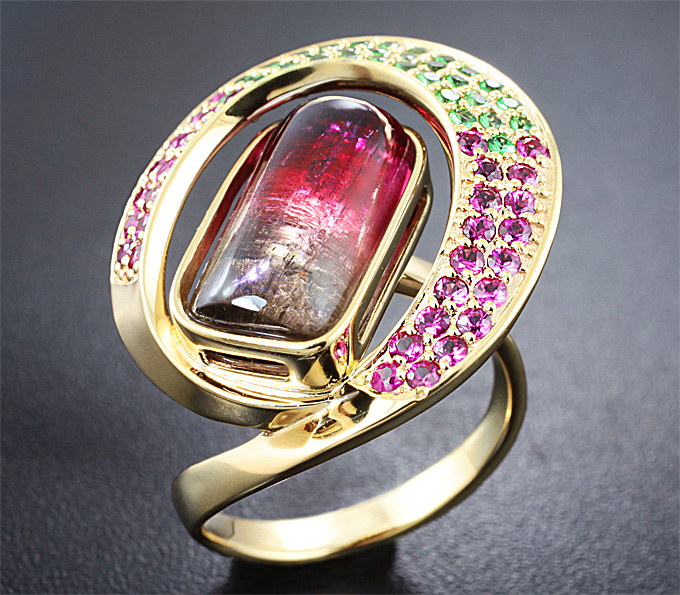 Кольцо с полихромным турмалином, пурпурными сапфирами и цаворитами гранатами