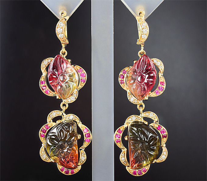 Серьги с резными арбузными турмалинами, пурпурными сапфирами и бриллиантами