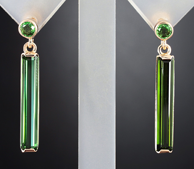 Вашему вниманию предлагаются серьги из золота 585 пробы с зелеными турмалинами и цаворитами гранатами! Диаметр цаворитов 2 мм. Площадка серег 28 х 4 мм. Вес пары 3 г. Ниже приводятся ювелирные характеристики турмалинов.