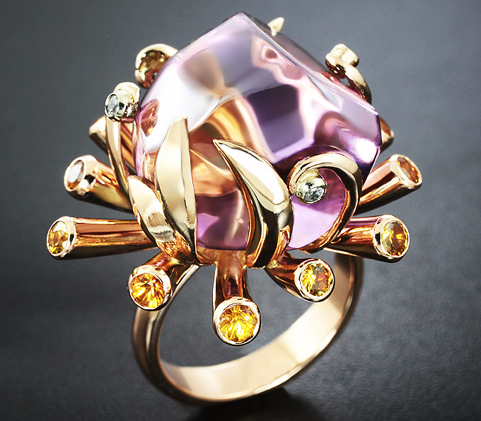 Кольцо с крупным кабошоном аметрина, желытми и бесцветными сапфирами