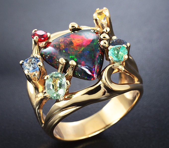 Кольцо с кристаллическим черным опалом и разноцветными сапфирами