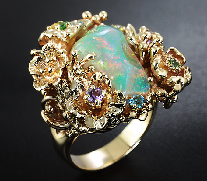 Кольцо с эфиопским опалом и самоцветами