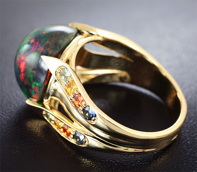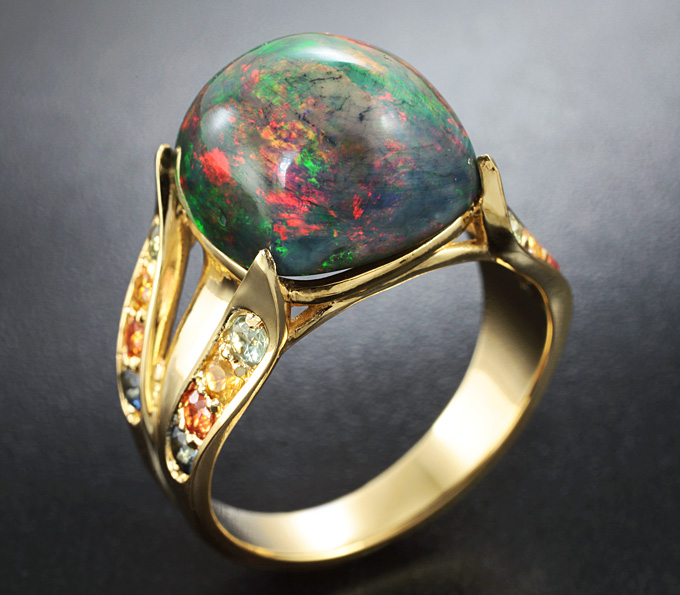 Кольцо с кристаллическим черным опалом и разноцветными сапфирами