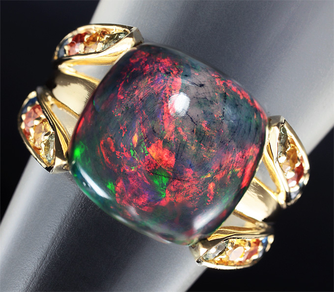 Вашему вниманию предлагается кольцо из золота 750 пробы с кристаллическим черным опалом и разноцветными сапфирами! Основные цвета опалесценции: красный, желтый и зеленый. Диаметр сапфиров 2 мм. Площадка 19 х 11 мм, высота 9 мм. Вес изделия 5,7 г. Размер 16,5. Ниже приводятся ювелирные характеристики вставки.