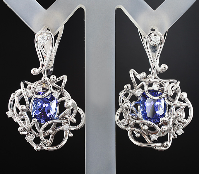 Вашему вниманию предлагаются серьги из золота 585 пробы с танзанитами и бриллиантами! Диаметр бриллиантов 1,5 мм и 2,5 мм. Площадка серег 32 х 21 мм. Вес пары 10,8 г. Ниже приводятся ювелирные характеристики танзанитов.