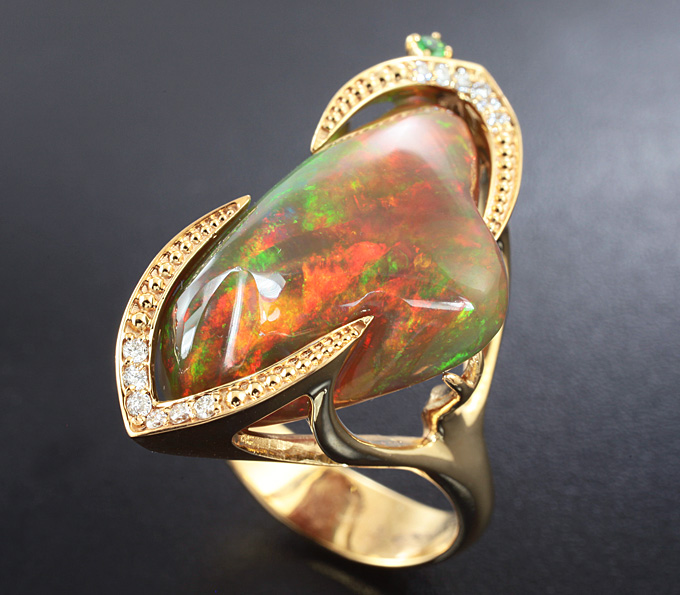 Кольцо с фантастическим опалом, бриллиантами и цаворитом гранатом