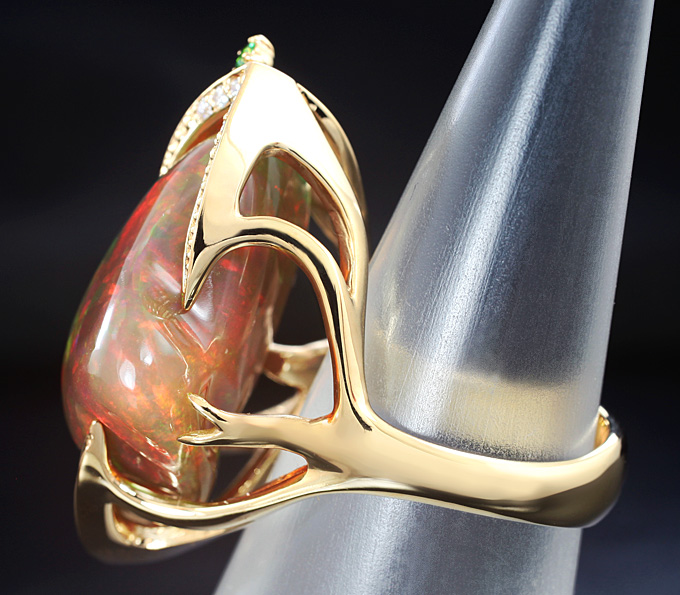 Вашему вниманию предлагается кольцо из золота 585 пробы с фантастическим опалом, бриллиантами и цаворитом гранатом! Диаметр дополнительной инкрустации 1,25 мм и 2 мм. Площадка 30 х 17 мм, высота 11 мм. Вес изделия 10,5 г. Размер 16,5. Ниже приводятся ювелирные характеристики опала.