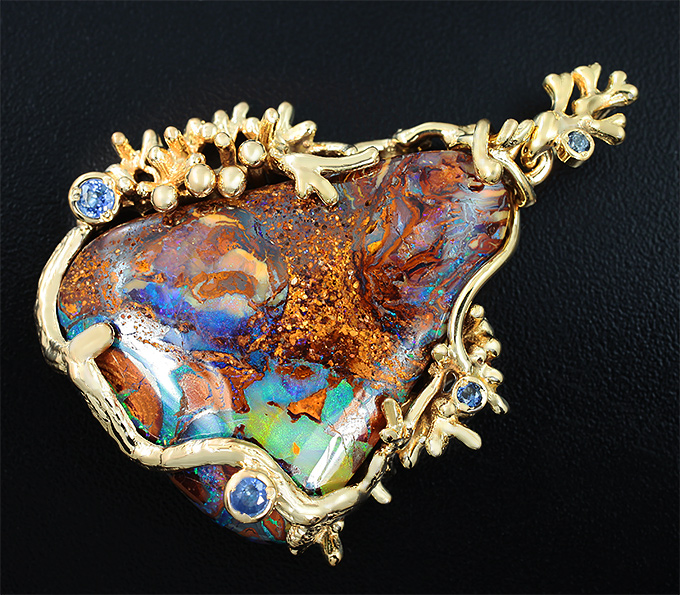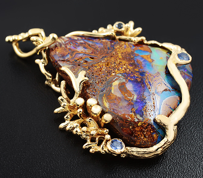 Вашему вниманию предлагается кулон из стерлингового серебра (925 проба) с болдер опалом и синими сапфирами! Изделие позолочено. Диаметр сапфиров 2 мм и 3 мм. Размеры кулона с петлей 40 х 30 мм. Вес 8,9 г. Ниже приводятся ювелирные характеристики опала.