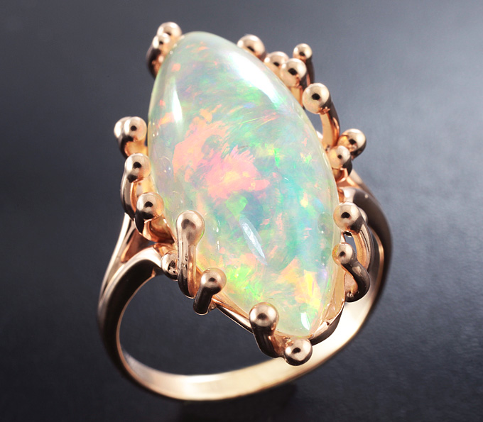 Вашему вниманию предлагается кольцо из золота 585 пробы c кристаллическим Welo опалом! Основные цвета опалесценции: красный, желтый и зеленый. Площадка 28 х 16 мм, высота 9 мм. Вес изделия 7,8 г. Размер 19. Ниже приводятся ювелирные характеристики вставки.