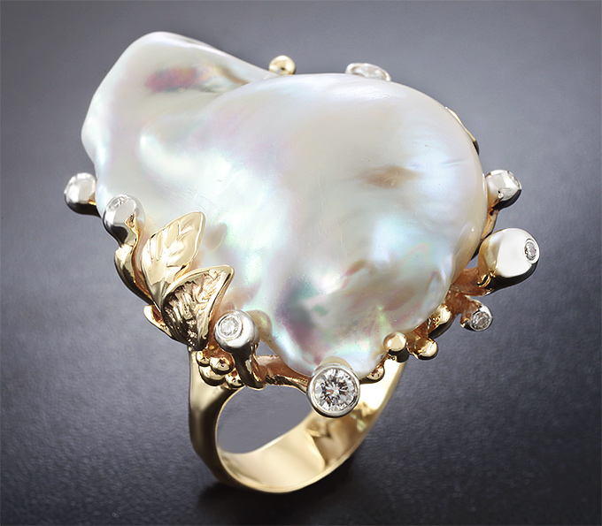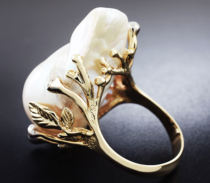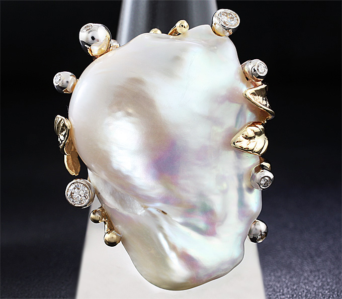 Вашему вниманию предлагается кольцо из золота 585 пробы с жемчужиной Mabe и бриллиантами! Размеры жемчужины 31 х 22 мм, диаметр бриллиантов от 1 мм до 3 мм. Площадка 34 х 27 мм, высота 16 мм. Вес изделия 21,7 г. Размер 20.