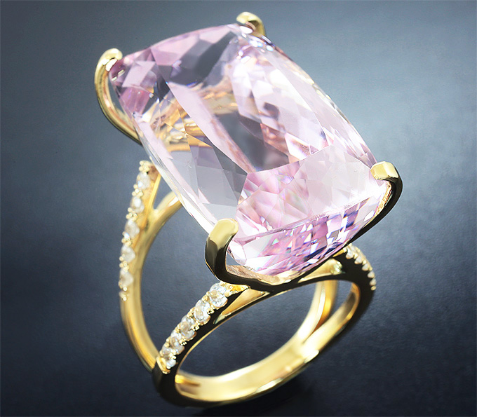 Вашему вниманию предлагается кольцо из золота 750 пробы с роскошным кунцитом и бесцветными цирконами! Диаметр цирконов 2 мм. Площадка 30 х 27 мм, высота 17 мм. Вес изделия 22,6 г. Размер 18,5. Ниже приводятся ювелирные характеристики кунцита.