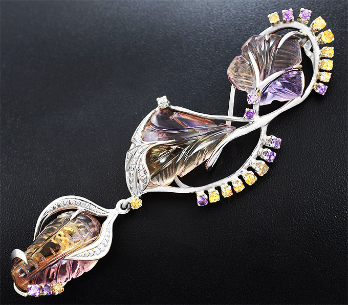 Вашему вниманию предлагается кулон из стерлингового серебра (925 проба) с резными аметринами и разноцветными сапфирами! Диаметр сапфиров 2 мм и 2,5 мм. Площадка кулона 79 х 24 мм. Вес 12,7 г. Ниже приводятся ювелирные характеристики аметринов.