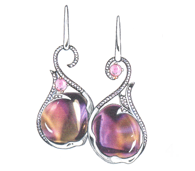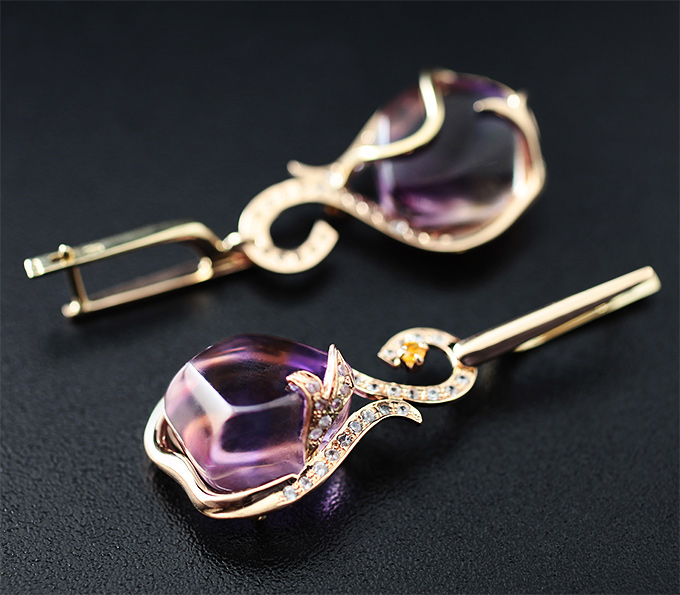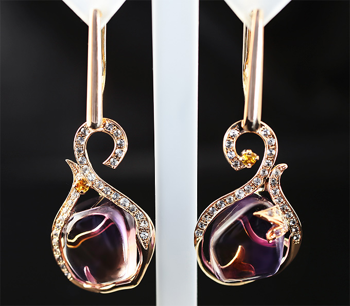 Серьги с аметринами, желтыми сапфирами и бесцветными цирконами