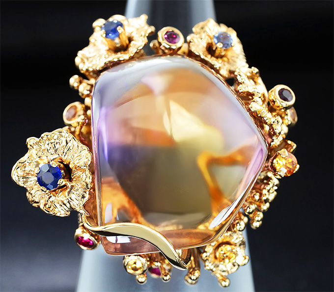 Вашему вниманию предлагается кольцо из золота 585 пробы c кабошоном аметрина и разноцветными сапфирами! Диаметр вставок 2 мм и 2,5 мм. Площадка 31 х 31 мм, высота 14 мм. Вес изделия 22,1 г. Размер 17. Ниже приводятся ювелирные характеристики вставки.