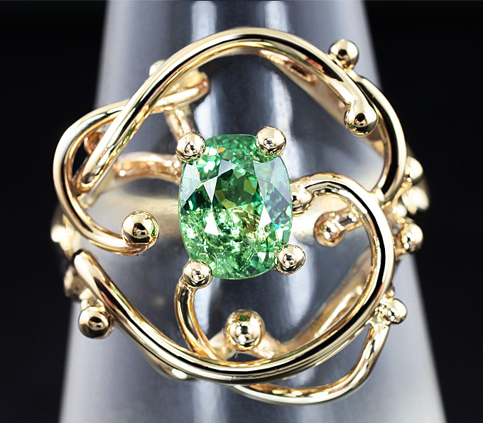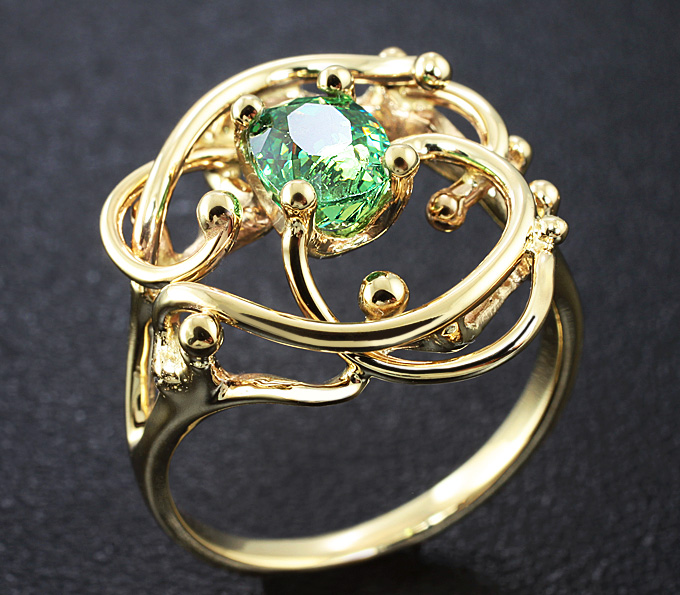 Вашему вниманию предлагается кольцо из золота 585 пробы c демантоидом! Площадка 18 х 18 мм, высота 7 мм. Вес изделия 4,7 г. Размер 17,5. Ниже приводятся ювелирные характеристики вставки.