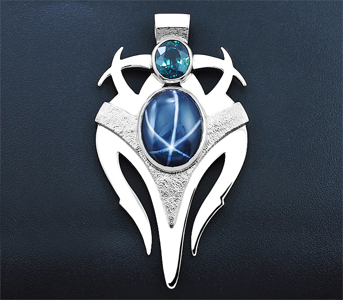 Вашему вниманию предлагается кулон из золота 585 пробы с полихромным и звездчатым сапфирами! Площадка кулона 59 х 33 мм. Вес 39,1 г. Ниже приводятся ювелирные характеристики.