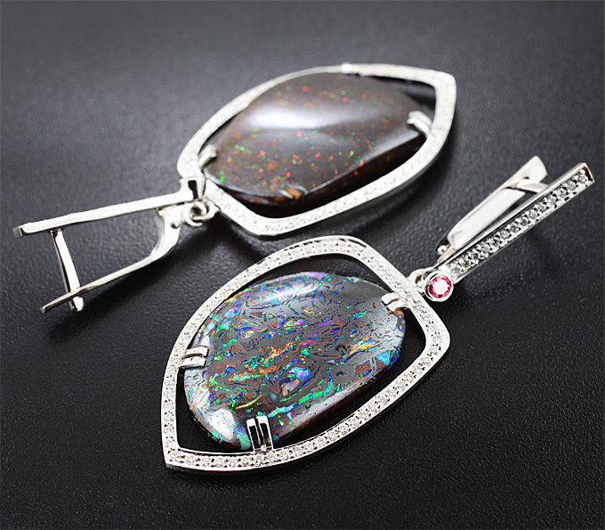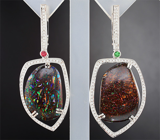 Серьги с австралийскими болдер опалами, цаворитом гранатом, красным сапфиром и бриллиантами