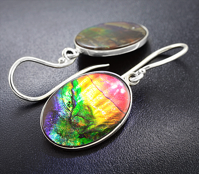 Вашему вниманию предлагаются серьги из стерлингового серебра (925 проба) с аммолитами аммонита! Цветовая палитра: красный, зеленый, синий и желтый. Размеры серег с петлей 44 х 17 мм. Вес пары 7,3 г. Ниже приводятся ювелирные характеристики вставок.