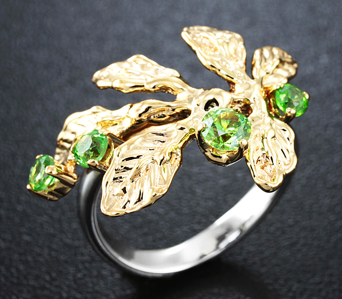 Вашему вниманию предлагается кольцо из золота 585 пробы с уральскими демантоидами! Площадка 25 х 18 мм, высота 6 мм. Вес изделия 6,3 г. Размер 17. Ниже приводятся ювелирные характеристики вставок.