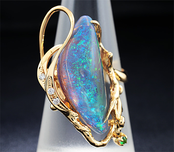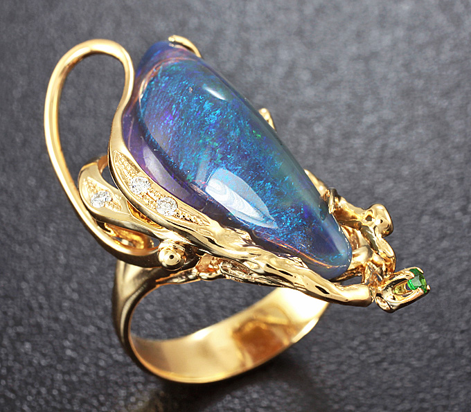 Кольцо c австралийским кристаллическим опалом, цаворитом гранатом и бриллиантами