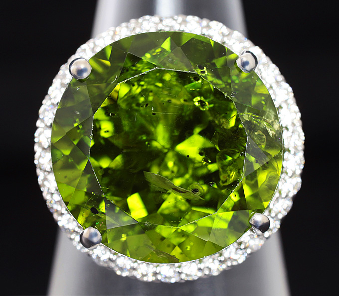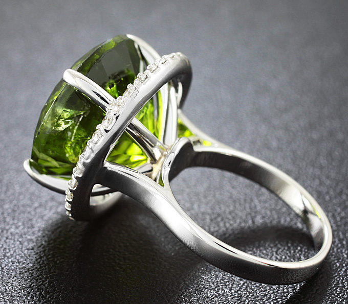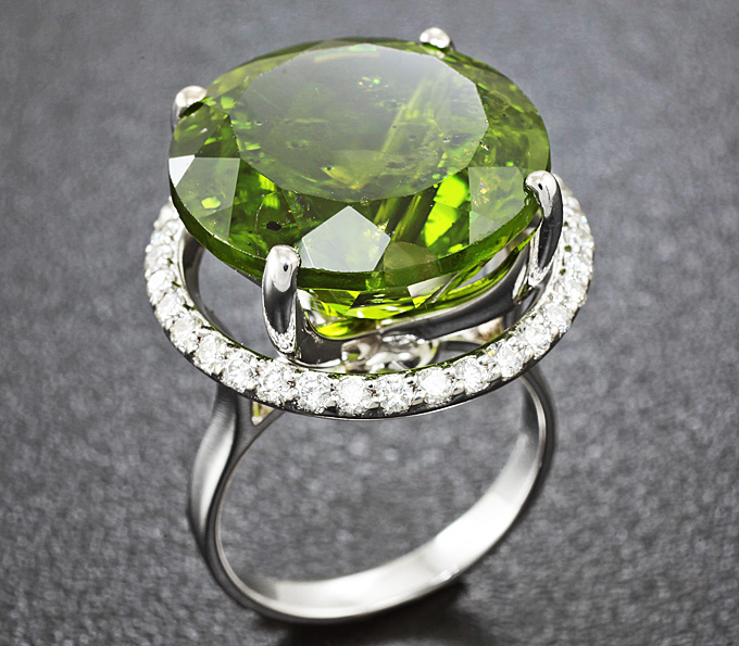 Вашему вниманию предлагается кольцо из золота 750 пробы c перидотом и бриллиантом! Диаметр бриллиантов 1,5 мм. Площадка 19 х 19 мм, высота 13 мм. Вес изделия 10,1 г. Размер 16. Ниже приводятся ювелирные характеристики перидота.