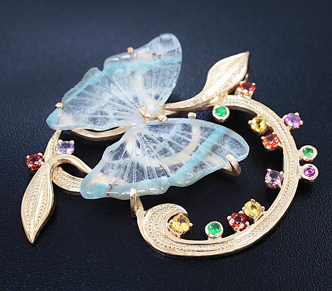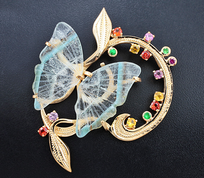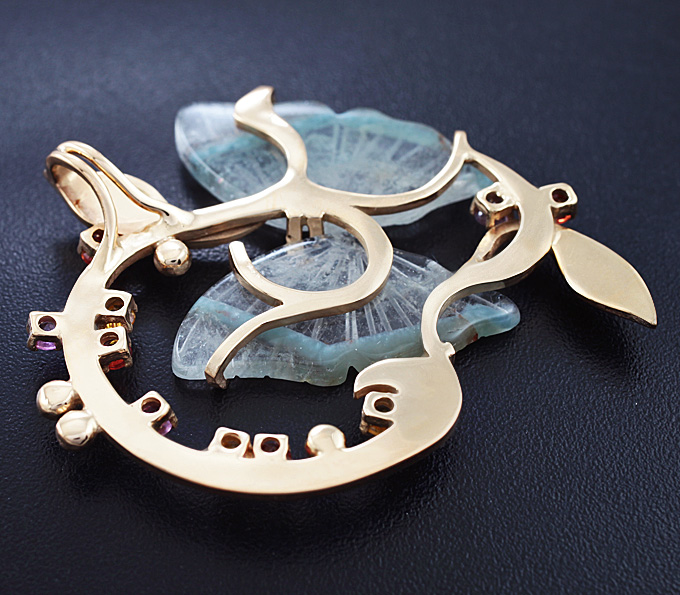 Кулон, инкрустированный парным резным кварцем с гилалитом и разноцветными сапфирами