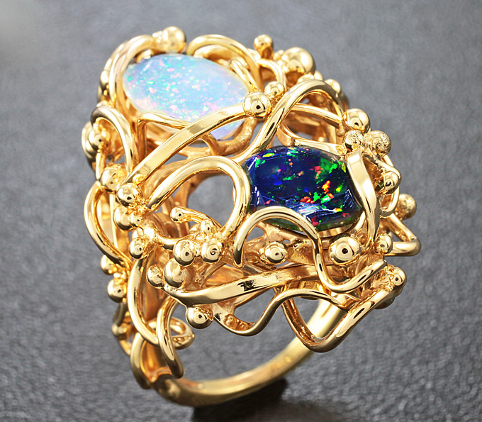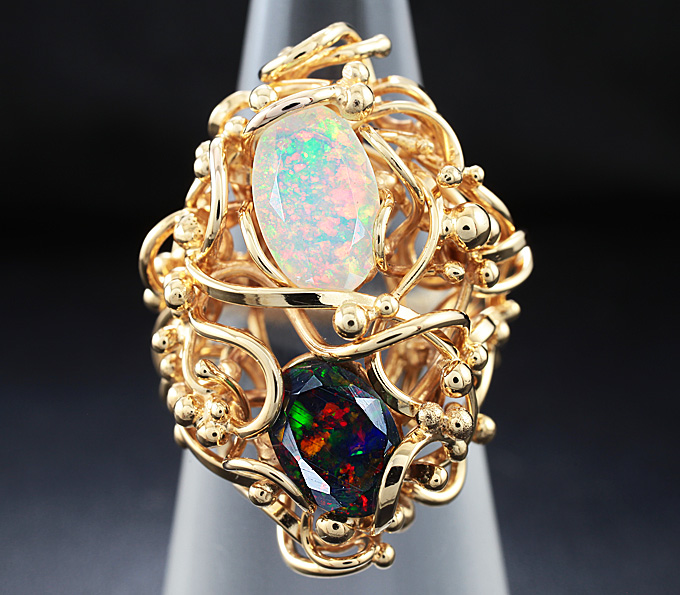 Кольцо с ограненными кристаллическими Welo и черным опалами
