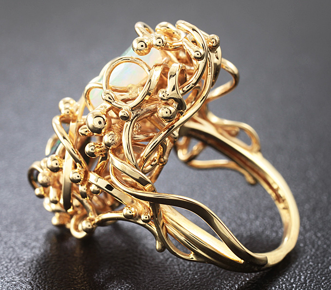 Вашему вниманию предлагается кольцо из золота 585 пробы с ограненными кристаллическими Welo и черным опалами! Основные цвета опалесценции: красный, желтый и зеленый. Площадка 31 х 22 мм, высота 12 мм. Вес изделия 12,1 г. Размер 16,5. Ниже приводятся ювелирные характеристики вставок.