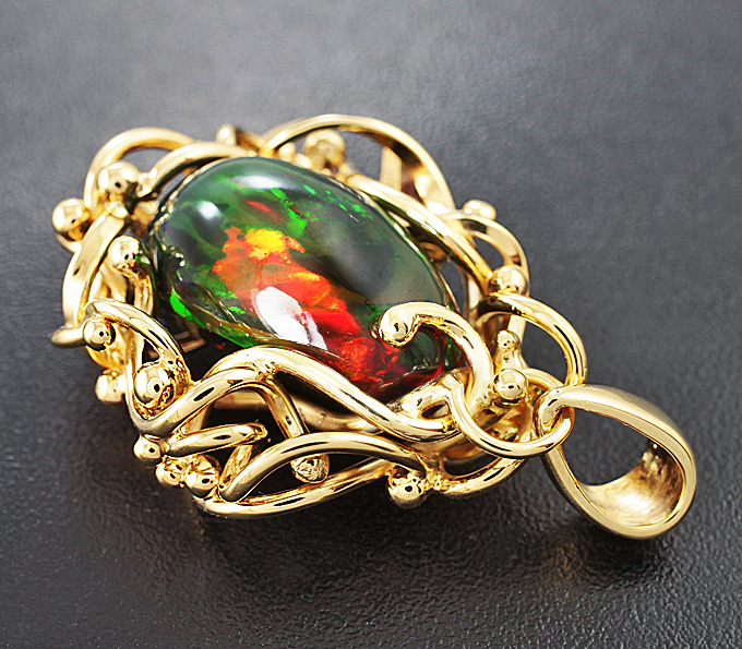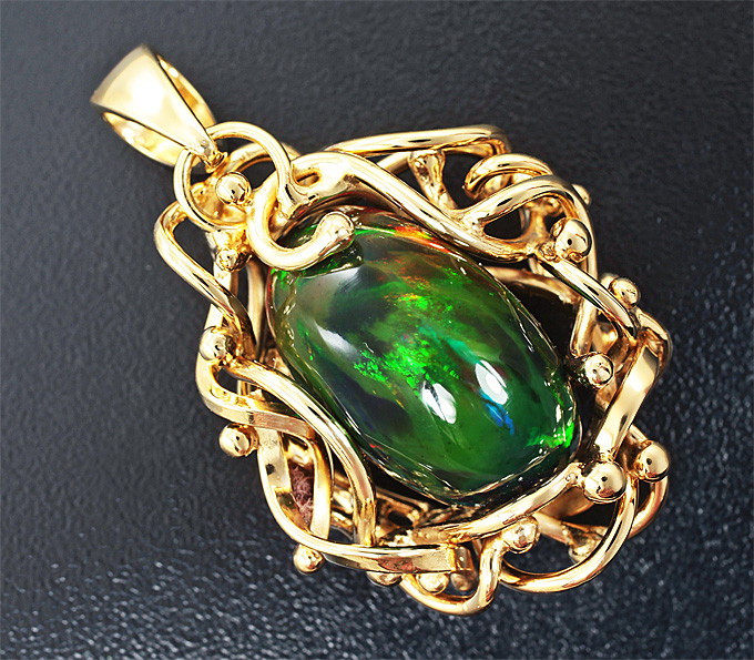 Вашему вниманию предлагается кулон из золота 585 пробы с кристаллическим черным опалом! Основные цвета опалесценции: красный, зеленый и синий. Размеры кулона с петлей 34 х 20 мм. Вес 7,2 г. Ниже приводятся ювелирные характеристики вставки.