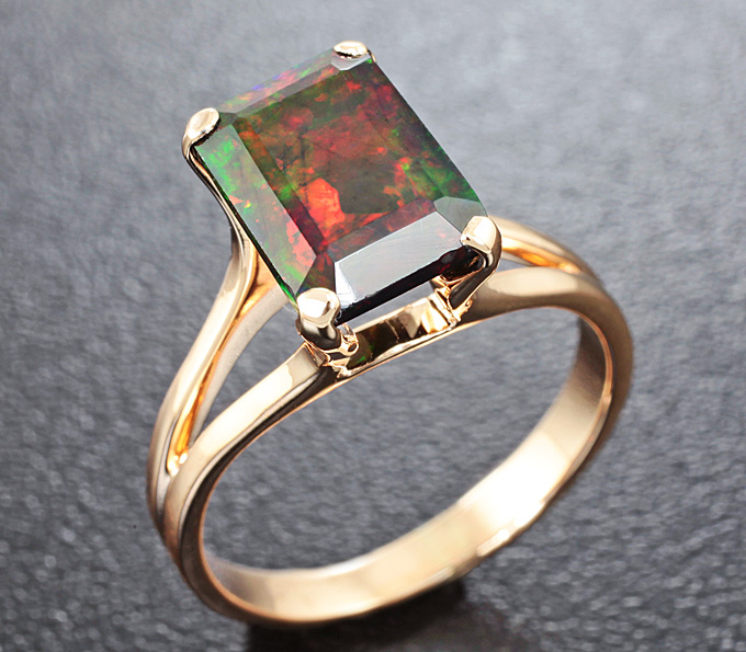 Вашему вниманию предлагается кольцо из золота 585 пробы с ограненным кристаллическим черным опалом! Основные цвета опалесценции: красный, желтый, синий и зеленый. Площадка 10 х 7 мм, высота 8 мм. Вес изделия 2,7 г. Размер 16. Ниже приводятся ювелирные характеристики вставки.
