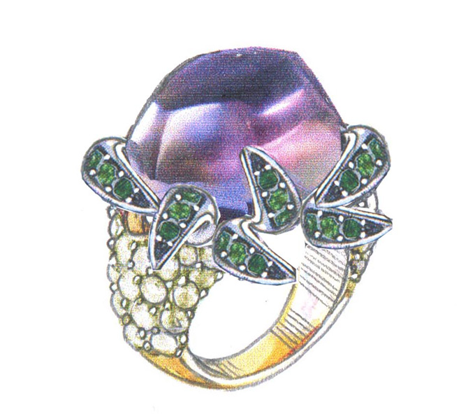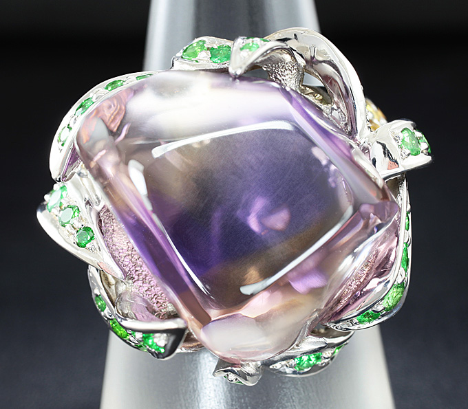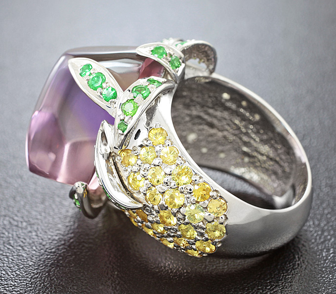 Кольцо c кабошоном аметрина, цаворитами гранатами и желтыми сапфирами