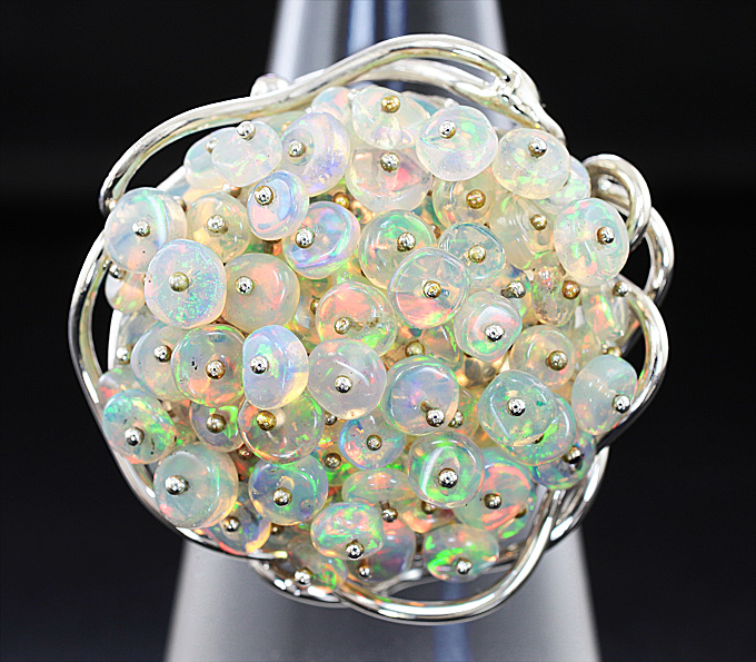 Вашему вниманию предлагается кольцо из стерлингового серебра (925 проба) c эфиопскими опалами! Диаметр вставок 3 мм и 4 мм. Площадка 28 х 26 мм, высота 16 мм. Вес изделия 14 г. Размер 18,5.