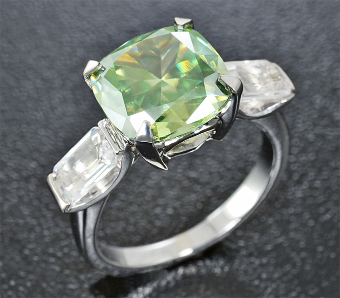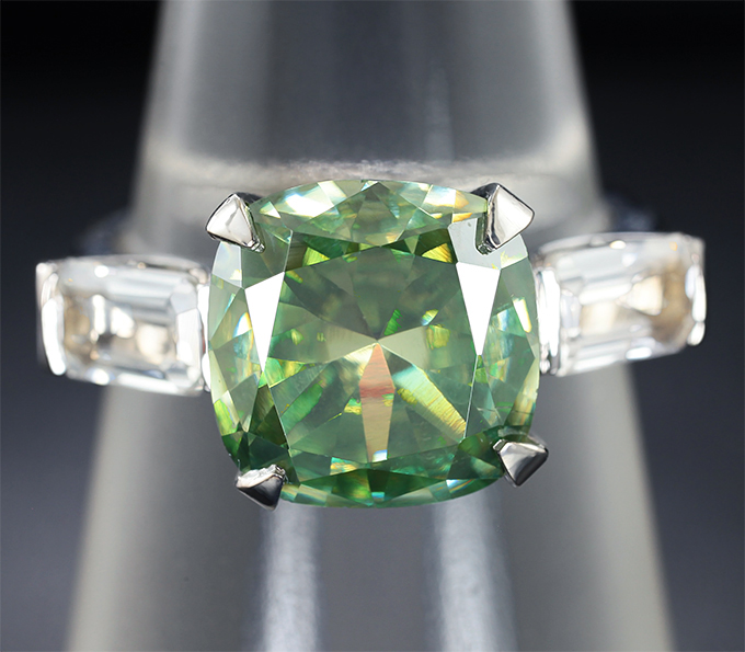 Вашему вниманию предлагается кольцо из золота 585 пробы с муассанитом и лейкосапфирами! Площадка 21 х 10 мм, высота 8 мм. Вес изделия 4,9 г. Размер 16,75. Ниже приводятся ювелирные характеристики вставок.