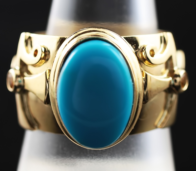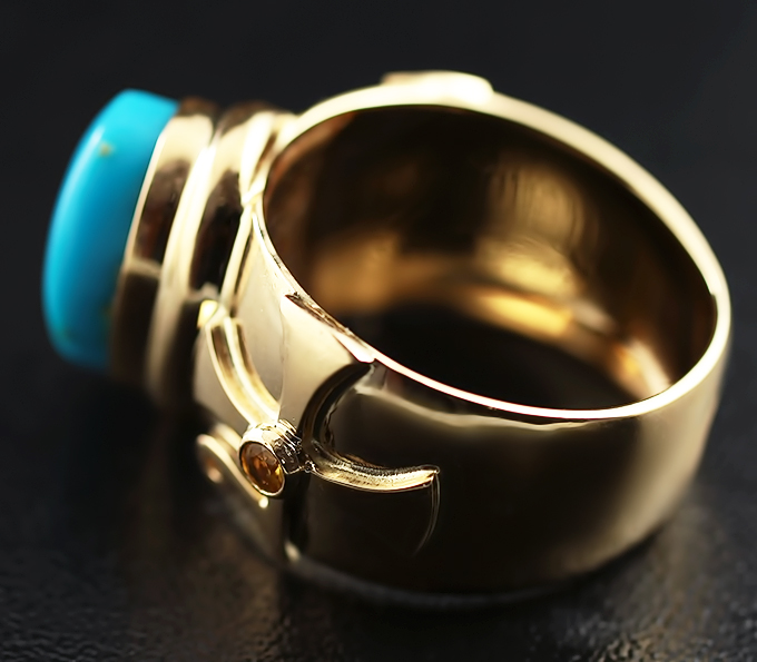 Вашему вниманию предлагается кольцо из золота 750 пробы с иранской бирюзой и желтыми сапфирами! Диаметр сапфиров 3 мм. Ширина площадки 17 мм, высота 10 мм. Вес изделия 19 г. Размер 21. Ниже приводятся ювелирные характеристики бирюзы.