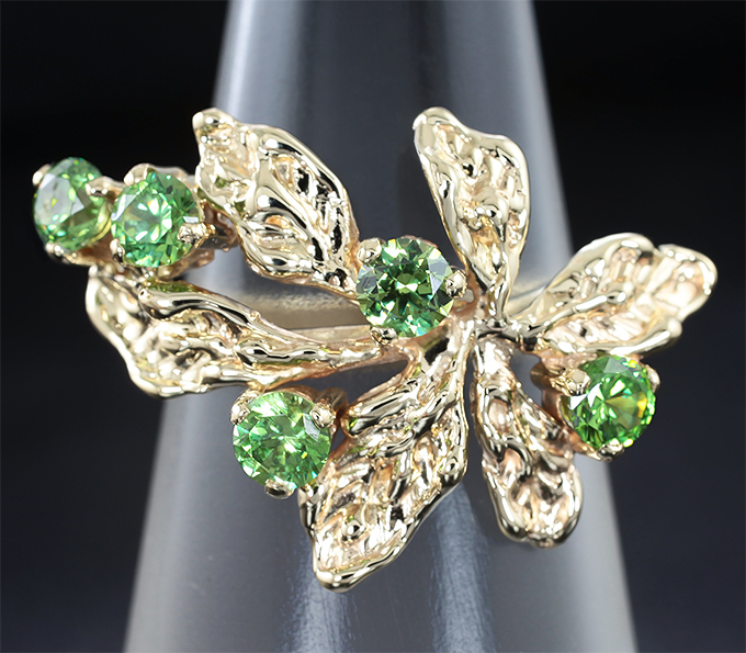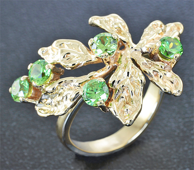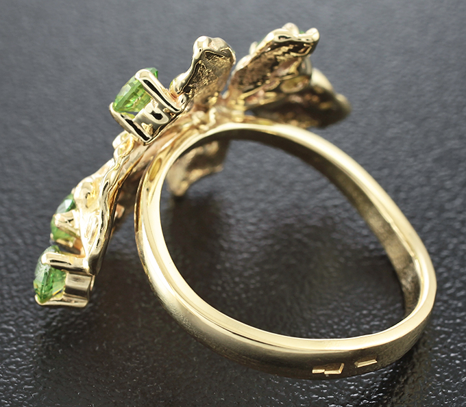 Вашему вниманию предлагается кольцо из золота 585 пробы c уральскими демантоидами! Площадка 26 х 18 мм, высота 5 мм. Вес изделия 5,7 г. Размер 17,5. Ниже приводятся ювелирные характеристики вставок.