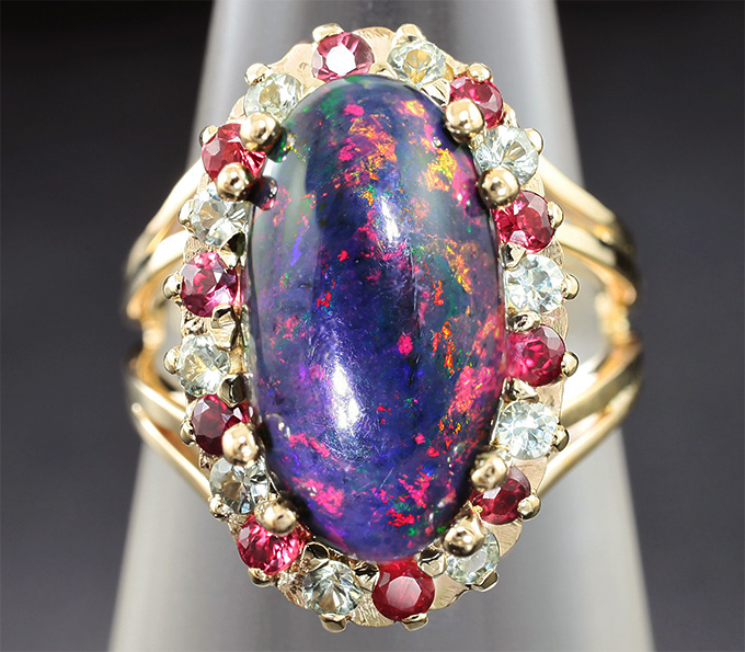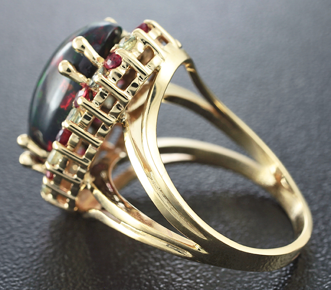 Вашему вниманию предлагается кольцо из золота 585 пробы c кристаллическим черным опалом, зелеными и красными сапфирами! Основные цвета опалесценции: красный и зеленый. Диаметр сапфиров 2 мм. Площадка 20 х 13 мм, высота 11 мм. Вес изделия 6,1 г. Размер 17. Ниже приводятся ювелирные характеристики вставки.