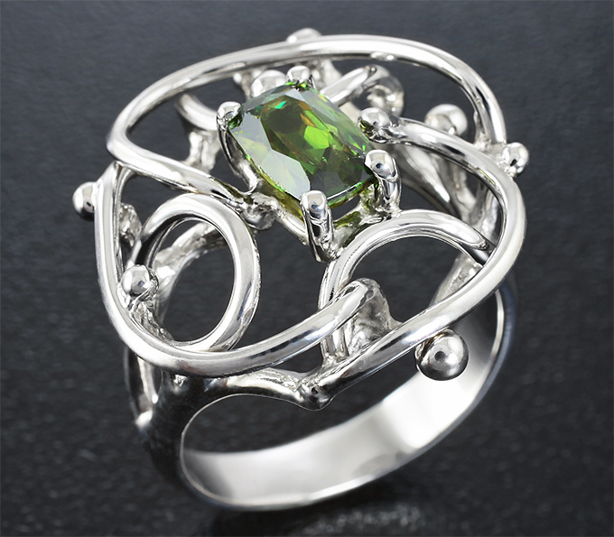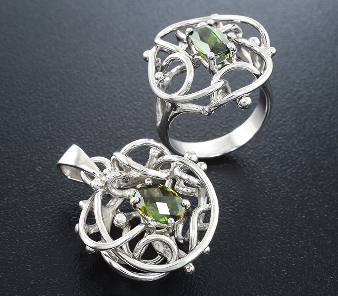 Вашему вниманию предлагается комплект (кольцо + кулон) из стерлингового серебра (925 проба) с зелеными сфенами! Вес комплекта 12,1 г.