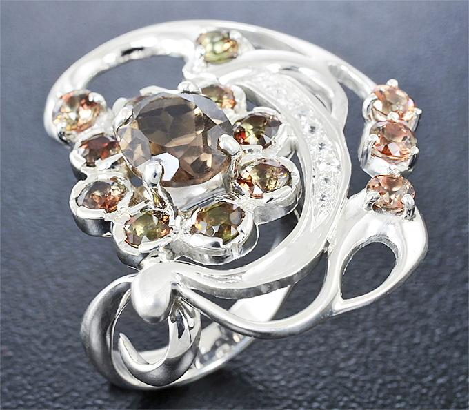 Кольцо c дымчатым кварцем, андалузитами и бесцветными цирконами