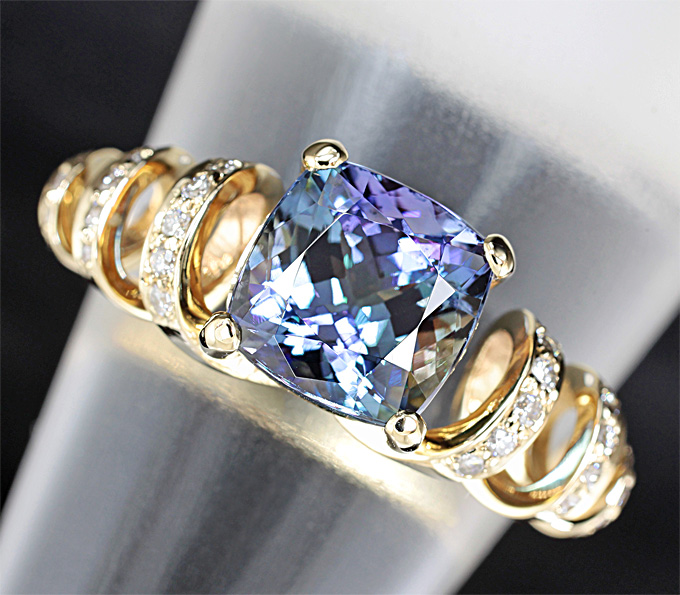 Вашему вниманию предлагается кольцо из золота 585 пробы с танзанитом и бриллиантами! Диаметр бриллиантов от 1 мм до 1,35 мм. Площадка 24 х 9 мм, высота 7 мм. Вес изделия 4,4 г. Размер 19. Ниже приводятся ювелирные характеристики танзанита.