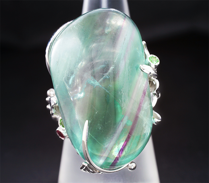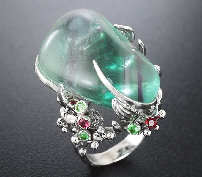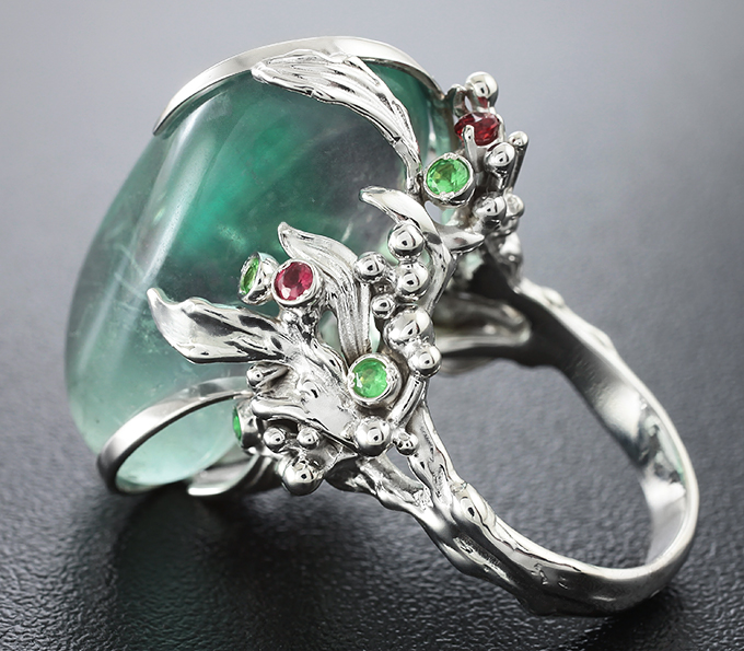 Кольцо c флюоритом, цаворитами гранатами и рубинами