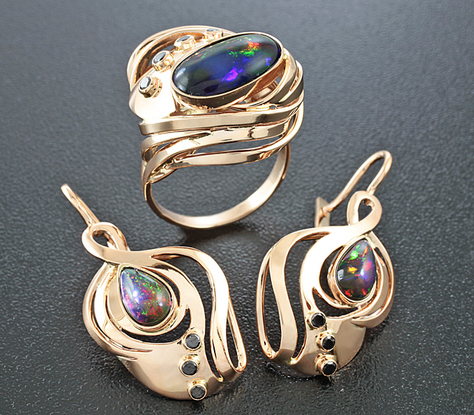 Вашему вниманию предлагается комплект (кольцо + серьги) из золота 585 пробы с черными опалами и бриллиантами! Размеры вставок от 2 мм до 15 х 10 мм. Вес комплекта 29,2 г.