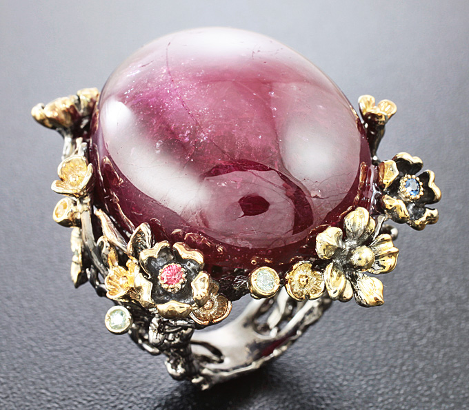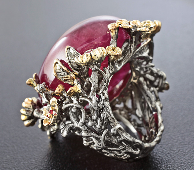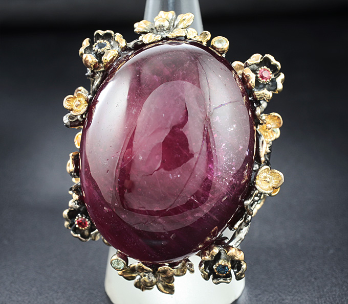 Кольцо c крупным кабошоном рубина и разноцветными сапфирами