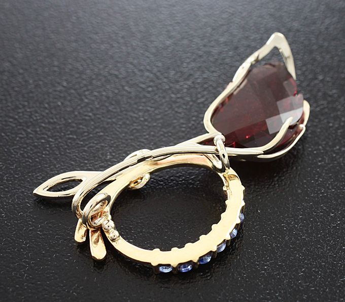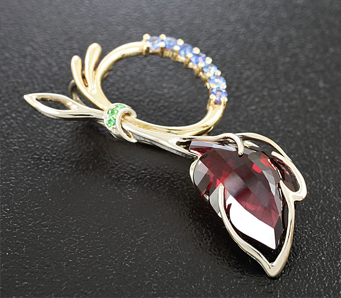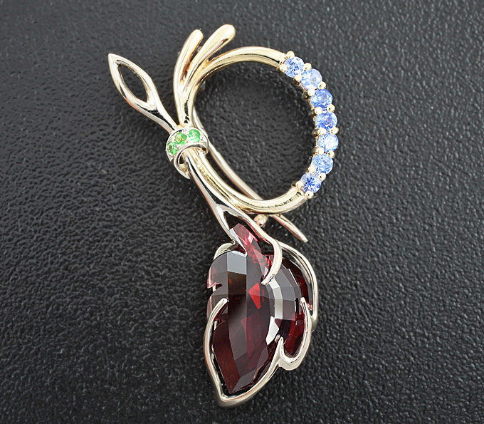 Брошь/кулон с крупной резной красной шпинелью, сапфирами и цаворитами гранатами