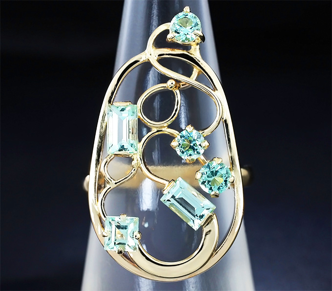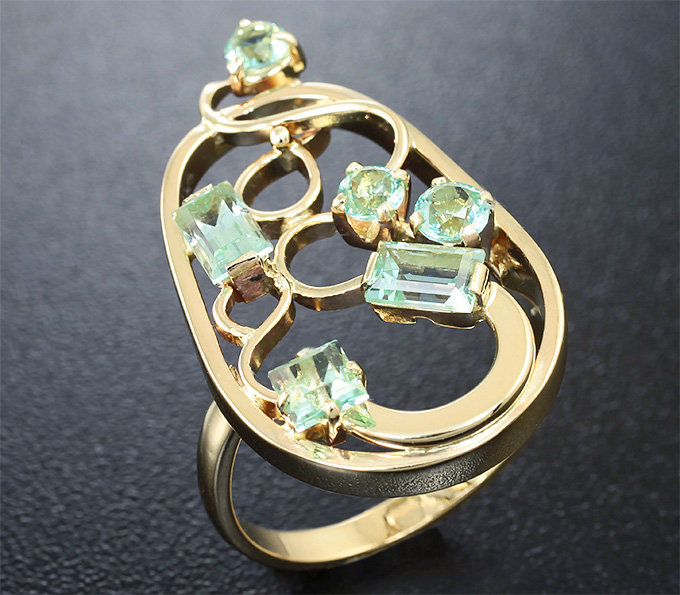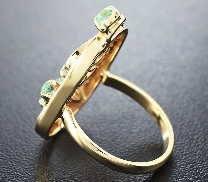 Вашему вниманию предлагается кольцо из золота 585 пробы с зелеными бериллами! Размеры вставок от 3 мм до 5,5 х 3,5 мм. Площадка 31 х 18 мм, высота 4 мм. Вес изделия 7,4 г. Размер 19.
